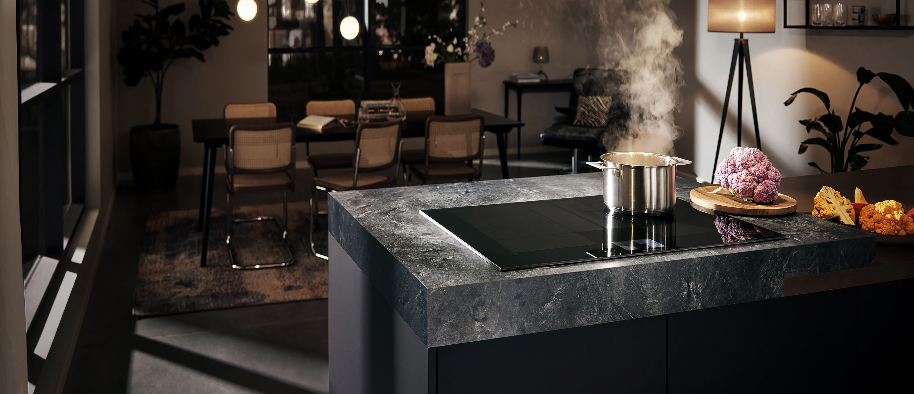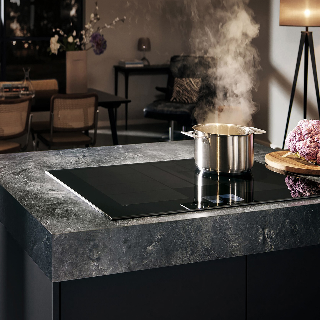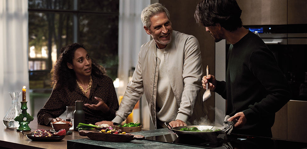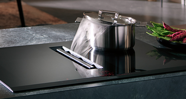 Wohnen, Kochen und Essen verschmelzen zu einem perfekten Miteinander. Moderne Küchen sind zum Wohnbereich hin geöffnet und integrieren sich nahtlos in dessen Ambiente. Mit inductionAir Plus kannst du diesen zeitgemäßen Look mit großzügiger Raumwirkung eindrucksvoll inszenieren. Denn es kombiniert ein Induktionskochfeld der Spitzenklasse mit einem bündig in die Glaskeramik eingelassenen Dunstabzug. Das vollkommen plane, elegante Design verleiht jeder Küche, egal ob mit Kochinsel oder Küchenblock, aus jedem Blickwinkel ein edles Aussehen.