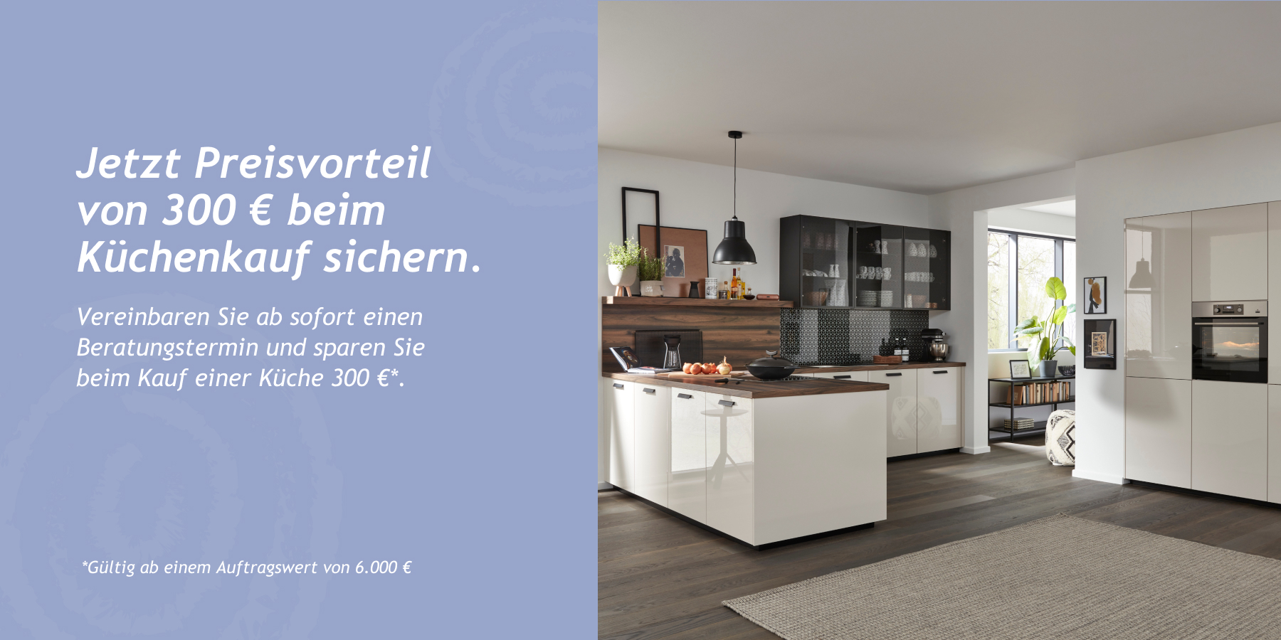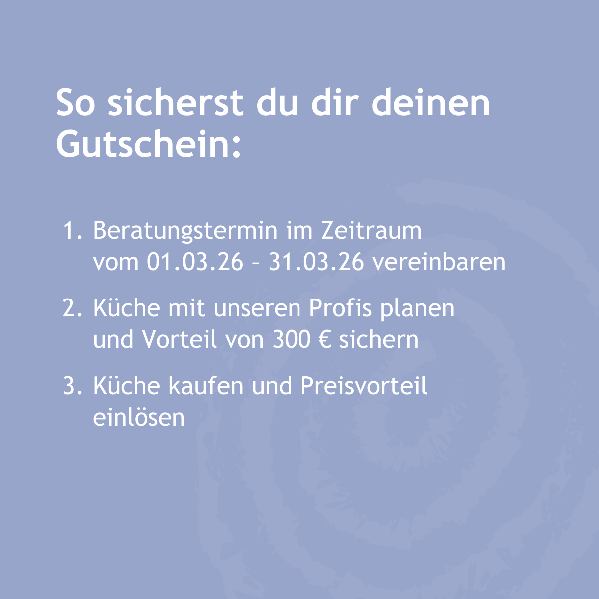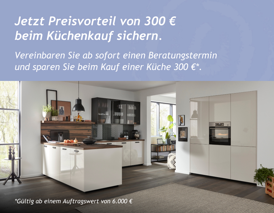 Nach Ihrem wahrgenommenen Beratungstermin erhalten Sie Ihren Preisvorteil von 300 € als Gutschein, den Sie beim späteren Kauf Ihrer neuen Küche einlösen können.
